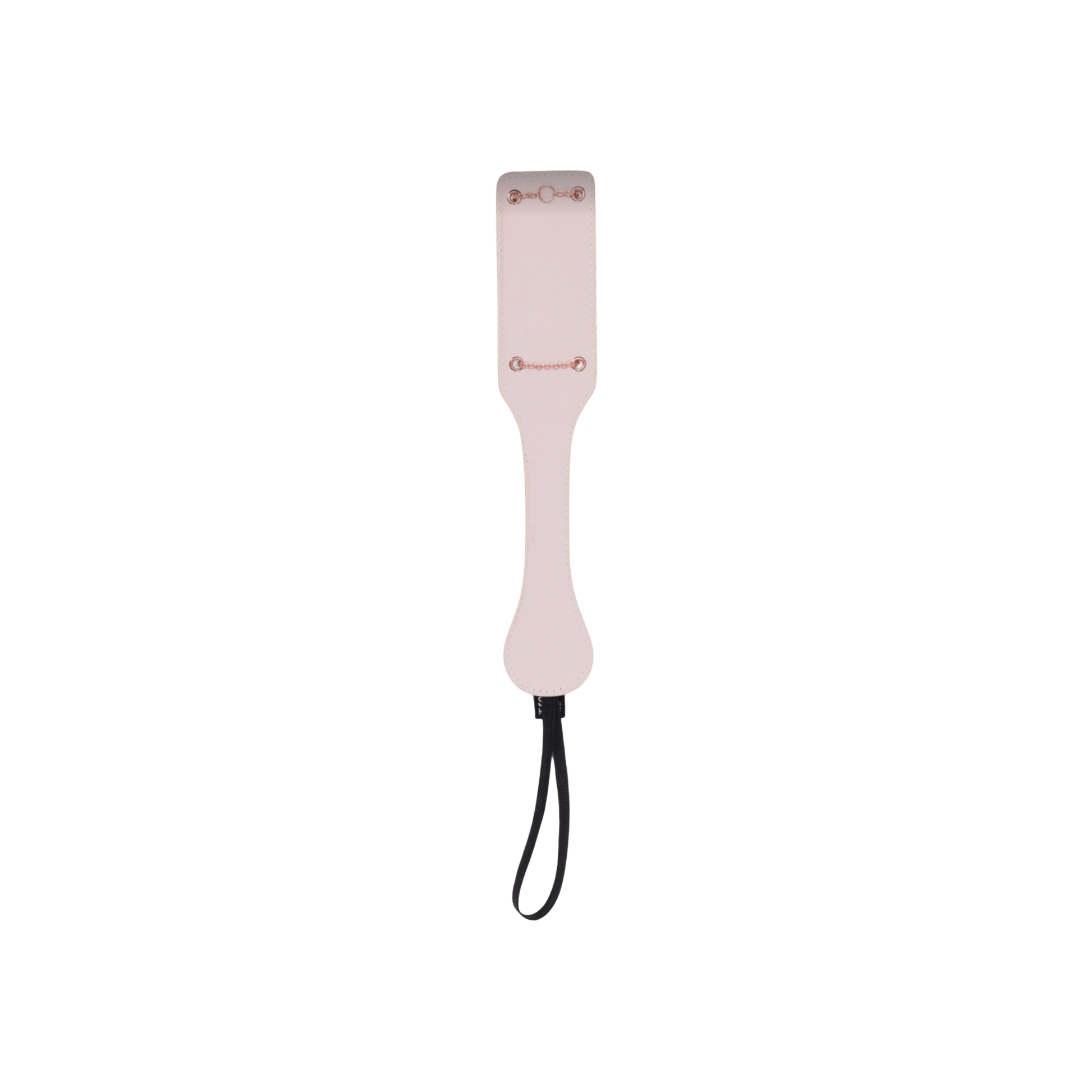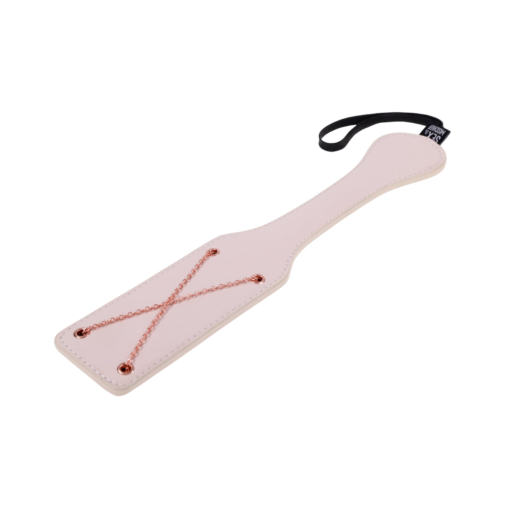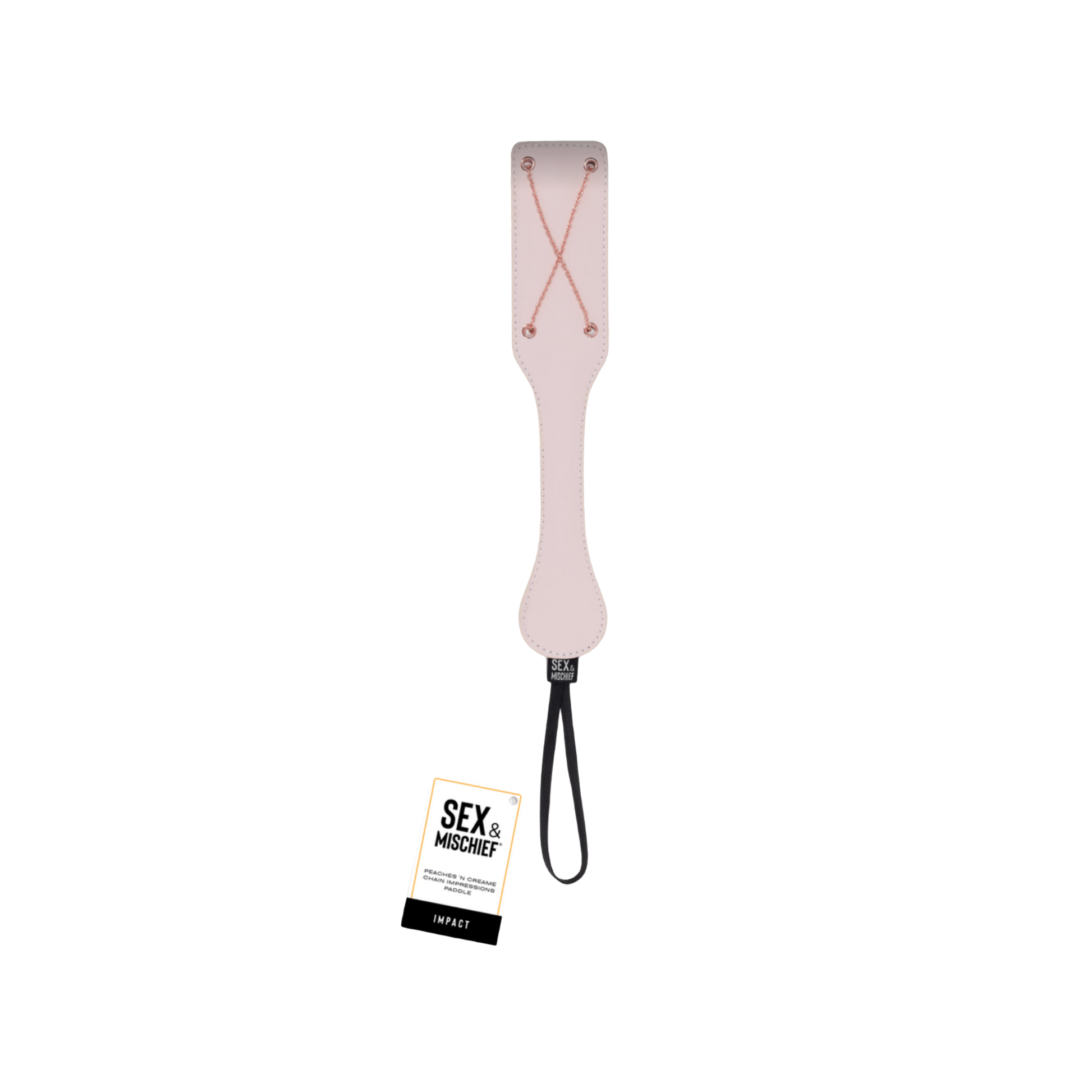 Choose your own pleasure. The Peaches ‘N CreaMe Chain Paddle is crafted from soft, smooth faux leather with detailed saddle-stitching and sealed edges for lasting durability. One side features crisscrossed rose gold chains for bold texture, marking the skin with intent, because X always marks the spot. The other side offers a smoother chain-lined surface for a gentler touch. From a stinging tease to sharper correction, deliver every strike with purpose. A secure wrist loop ensures a steady grip, easy storage, and even easier surrender.